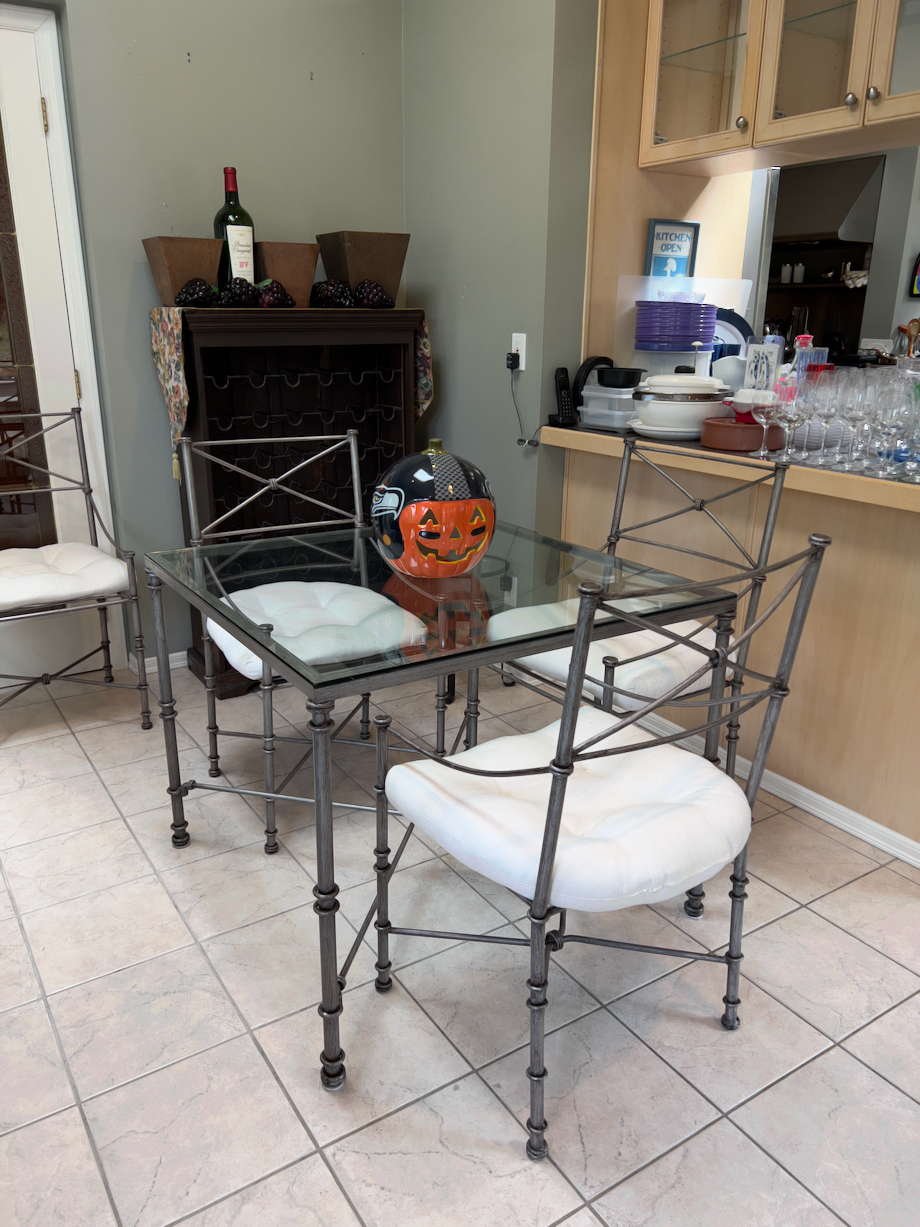 Metal glass table with 4 metal chairs